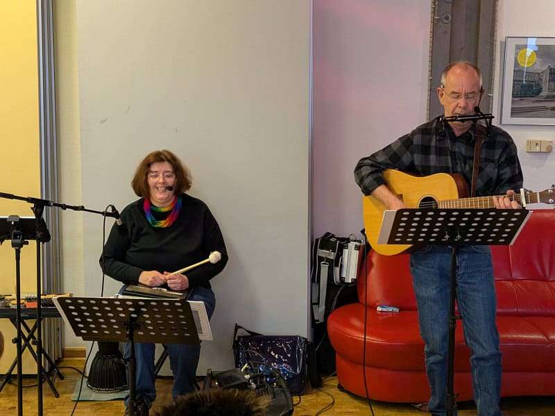 Neben eigenen Songs – auch von unserer aktuellen CD „So sei die Welt“ – haben wir dem Publikum beim Neujahrsempfang des Eine-Welt-Forums auch zwei Protestlieder gegen die Trump-Regierung aus den USA mitgebracht, die auf besonderes Interesse stoßen. „We dissent“ verlangt dabei auch Klänge aus der Mundharmonika, die Joachim neben Gesang und Gitarre auch noch beiträgt – geht doch! Sigrun wird zwischendurch zur Drummerin… Zwischen unseren Sets unterhalten ein jesidischer Violinist und ein jesidischer Sänger die Gäste, so wird es also ein sehr internationales Konzert.
