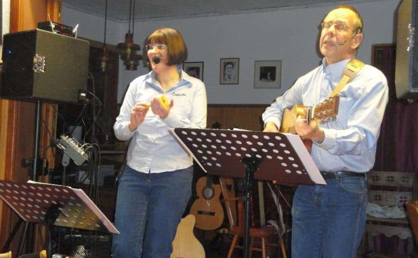 Da der plötzliche Wintereinbruch Heideruh fast von der Außenwelt abgeschnitten hat, sind leider nicht so viele Gäste gekommen wie erwartet. Dennoch wird es ein interessanter und schöner Abend, und „Dona Dona“ singen und spielen wir sogar mit Olaf gemeinsam.