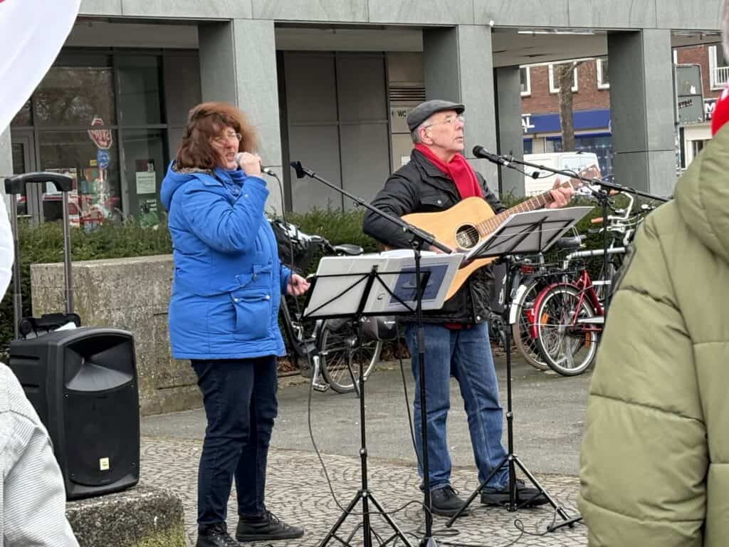 Mit etwas Verspätung ist der Demonstrationszug unterwegs, so dass wir etwas Wartezeit haben (und uns verpflegen können). Während wir unsere Hälse und damit die Stimmen ganz gut warmhalten können, muss Joachim doch zwischendurch mal seine Finger auftauen. Denn das ist die wahre Herausforderung von Open-Air-Auftritten bei unter 10 Grad Celsius, vor allem bei Wind: Das Gefühl in den Fingern geht leicht verloren. Die Teilnehmenden danken uns unser Engagement aber sehr, finden die neuen Strophen unseres „Dazu braucht’s Dich“-Songs super und freuen sich über die Unterstützung ihres Streiks. Wir wünschen viel Erfolg bei den Tarifforderungen!