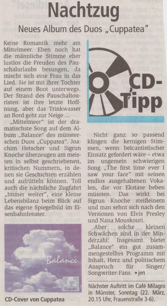 „Mittelmeer“ ist der dramatischste Song auf dem Album „Balance“ des münsterischen Duos „Cuppatea“. Joachim Hetscher und S. Knoche überzeugen am meisten in selbst geschriebenen kritischen Nummern, in denen sie Geschichten erzählen und aufrütteln können. Toll auch die nächtliche Zugfahrt „Immer weiter“, eine kleine Lebensbilanz beim Blick auf das eigene Spiegelbild im Eisenbahnfenster.