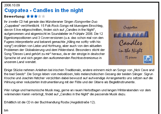 Seine zweite CD hat gerade das Münsteraner Singer-/Songwriter-Duo „Cuppatea“ veröffentlicht. 15 Folk-Rock-Songs mit bluesigem Einschlag, davon 5 live mitgeschnitten, finden sich auf „Candles in the Night“, aufgenommen und abgemischt im Soundatelier im Frühjahr 2006. Die 12 Eigenkompositionen und 3 Coverversionen (u. a. das schon mal von den Fugees interpretierte und bekannt gemachte „Killing me softly wih his song“) erzählen von Liebe und Hoffnung, aber auch von den aktuellen Problemen der Globalisierung und dem Widerstand. Besonders sticht der Song“ Dieses Land gehört zu mir“ heraus, da er der einzige in deutscher Sprache ist und sich gegen den aufkommenden Rechtsextremismus in unserem Land wendet.